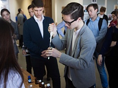 For the first time before the conference began, young talents had been offered to take part in entertaining chemical experiments, demonstrated by the teachers of the department “Chemistry, technology and chemical processing equipment”. Master-class for young chemists was given by associate professors, candidates of chemical sciences O.M. Ivankina and E.A. Perevalova. The participants with interest performed the experiments on qualitative reaction of some elements, familiarized themselves with basis of paper chroniatography, carried out the division of dyes, used in felt pens and a lot of other experiments.