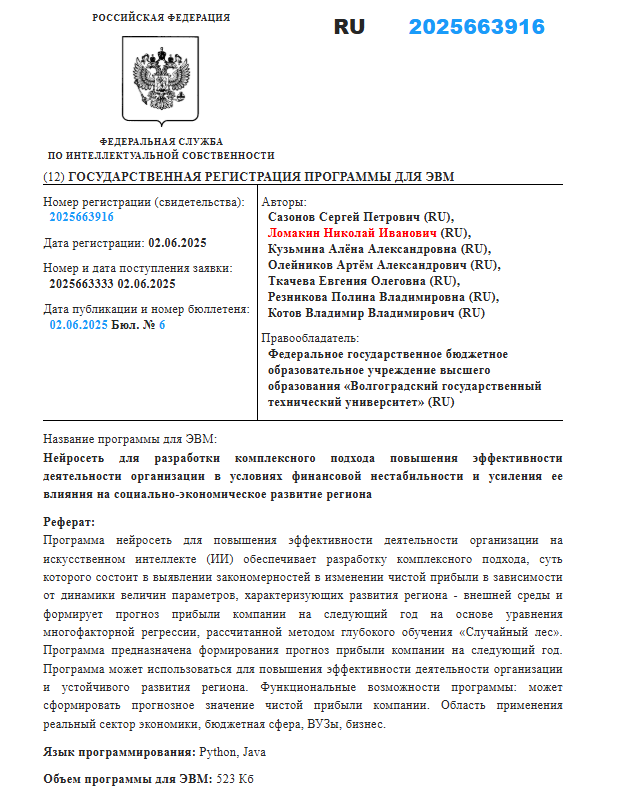 Свид. о гос. регистрации программы для ЭВМ № 2025663916 от 2 июня 2025 г. Российская Федерация. Нейросеть для разработки комплексного подхода повышения эффективности деятельности организации в условиях финансовой нестабильности и усиления ее влияния на социально-экономическое развитие региона / С.П. Сазонов, Н.И. Ломакин, А.А. Кузьмина, А.А. Олейников, Е.О. Ткачева, П.В. Резникова, В. Котов; ФГБОУ ВО ВолгГТУ. - 2025.