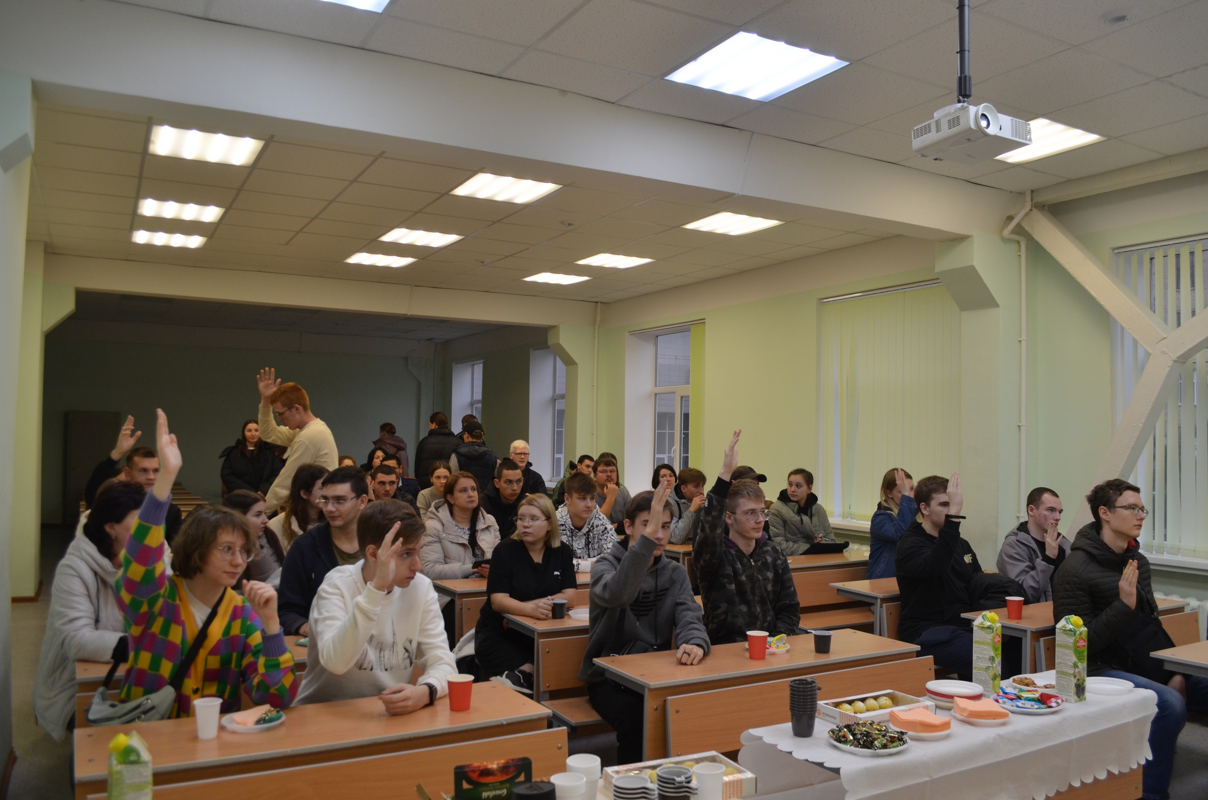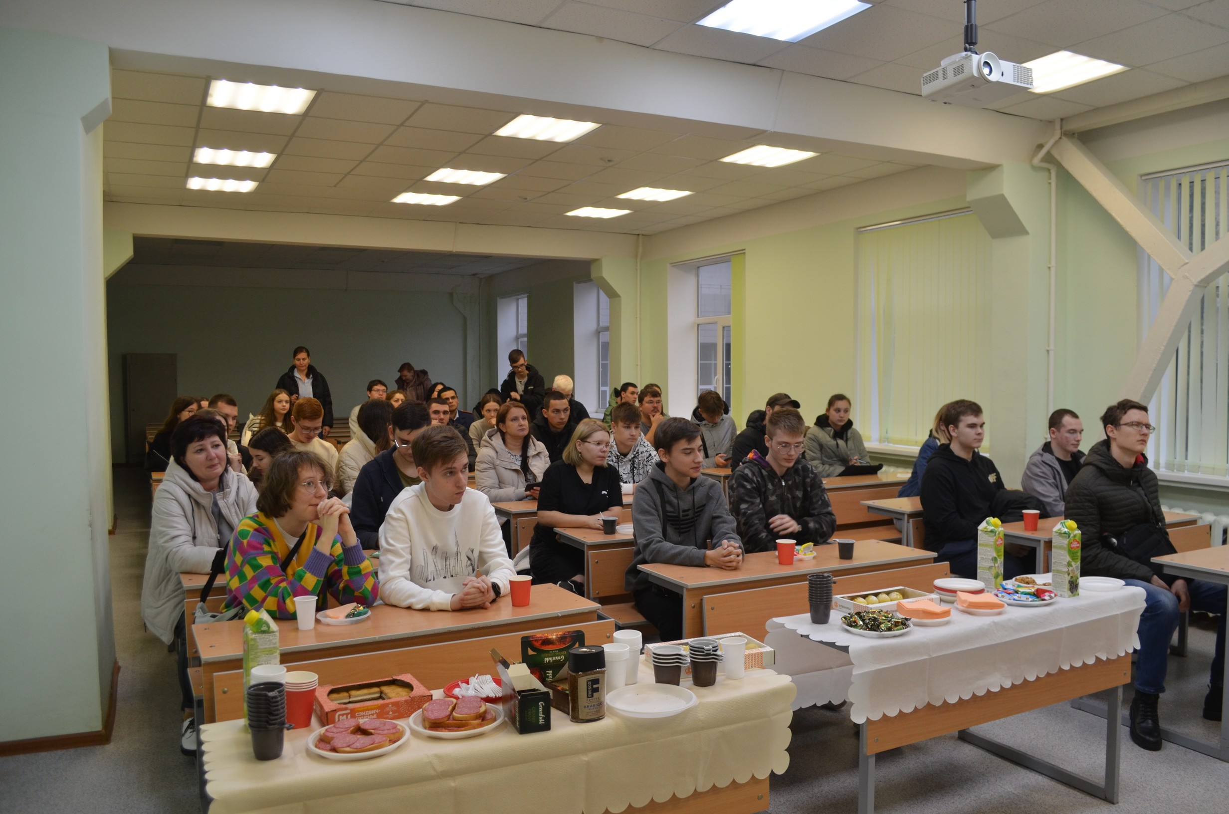 Затем общение с потенциальными абитуриентами было продолжено в неформальной обстановке. Во время чаепития заведующий кафедрой «Техническая эксплуатация и ремонт автомобилей» Евгений Александрович Захаров прокомментировал правила приема в вузы на 2024 год, рассказал о курсах в университете для подготовки к сдаче ЕГЭ, ответил на многочисленные вопросы о поступлении в вуз и особенностях обучения на факультете.