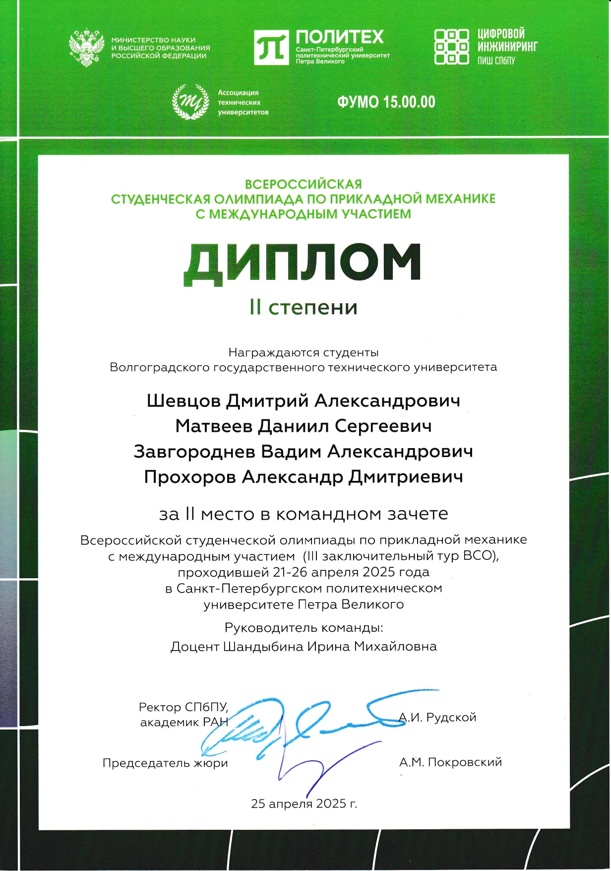 Завершилась олимпиада торжественной церемонией награждения, на которой были отмечены победители и призёры. Команда Волгоградского государственного технического университета заняла II место! Финальное слово организаторов, аплодисменты и атмосфера взаимного уважения стали достойным завершением насыщенных дней.