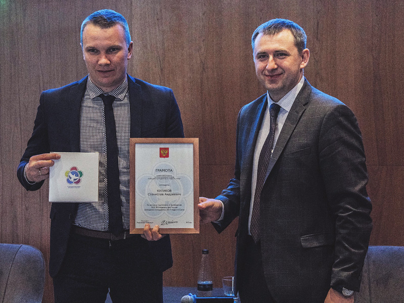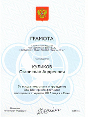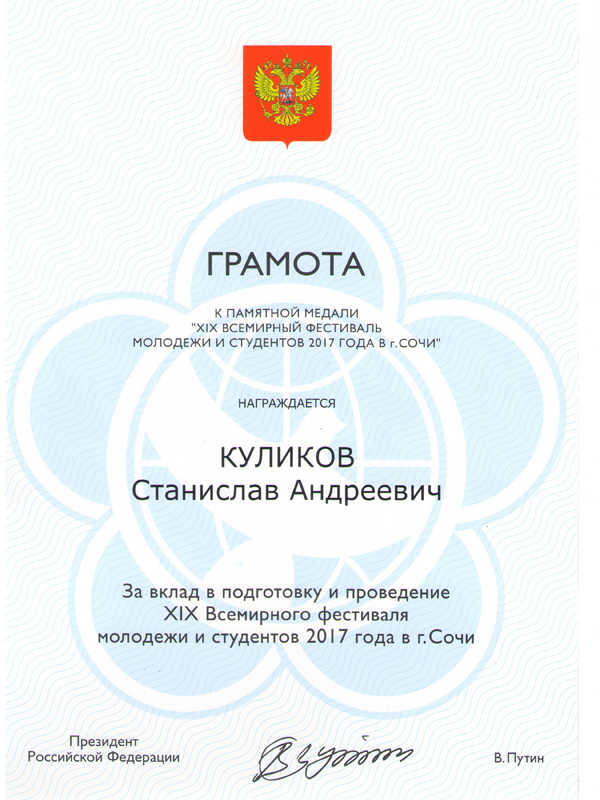 В рамках семинара-совещания по вопросам реализации государственной молодежной политики в субъектах Российской Федерации, проходившего с 23 по 25 апреля в Волгограде, Андрей Платонов, заместитель руководителя федерального агентства по делам молодежи (Росмолодежь), наградил Станислава Куликова, заместителя председателя профкома студентов ВолгГТУ, грамотой и памятной медалью за вклад в подготовку и проведение XIX Всемирного фестиваля молодежи и студентов 2017 года в г. Сочи.