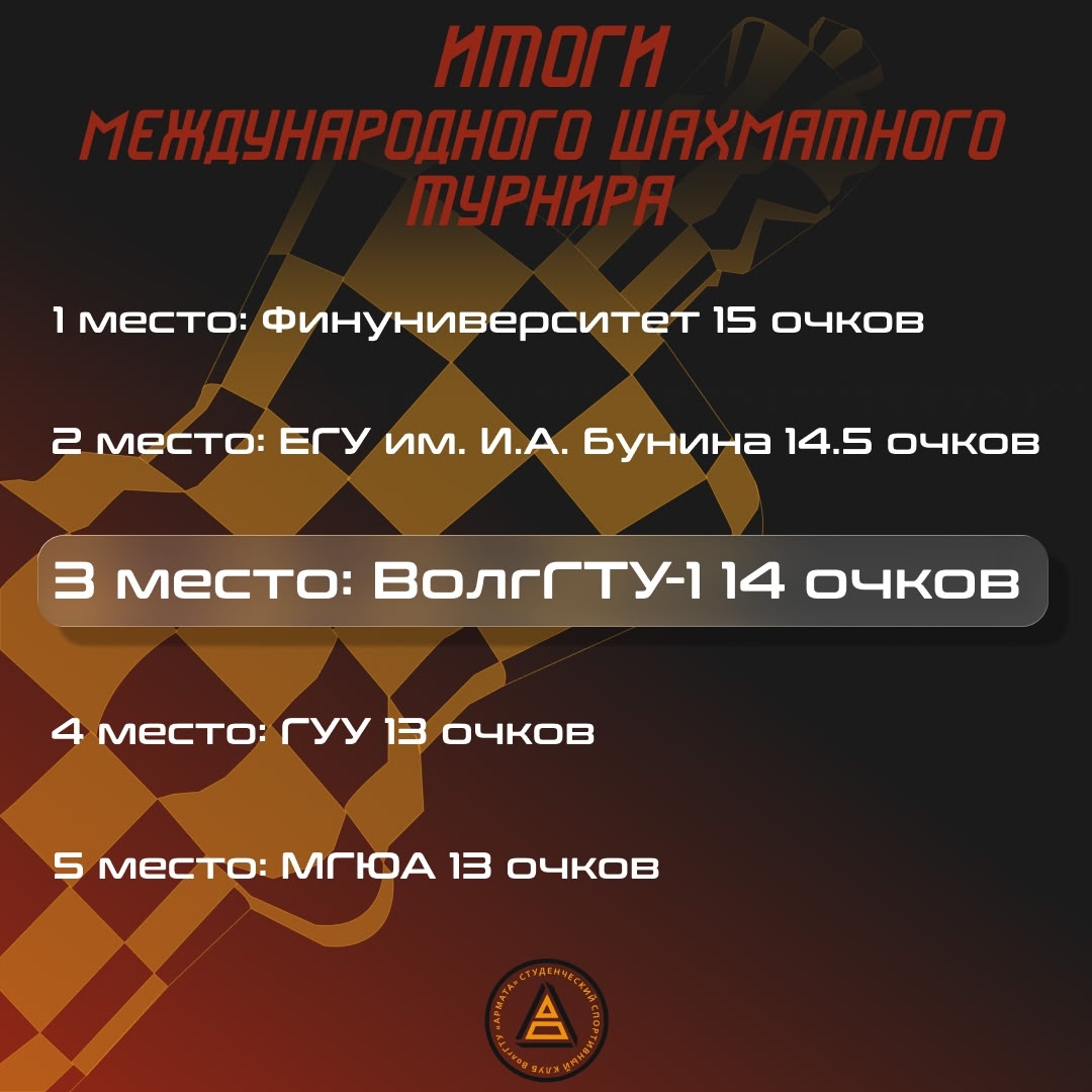 Состоялся Международный студенческий шахматный турнир, приуроченный к 105-летию Российского Государственного Университета имени А.Н. Косыгина, который собрал 100 команд из России и Беларуси. Соревнования состоялись в формате онлайн на площадке ChessOpen Play.