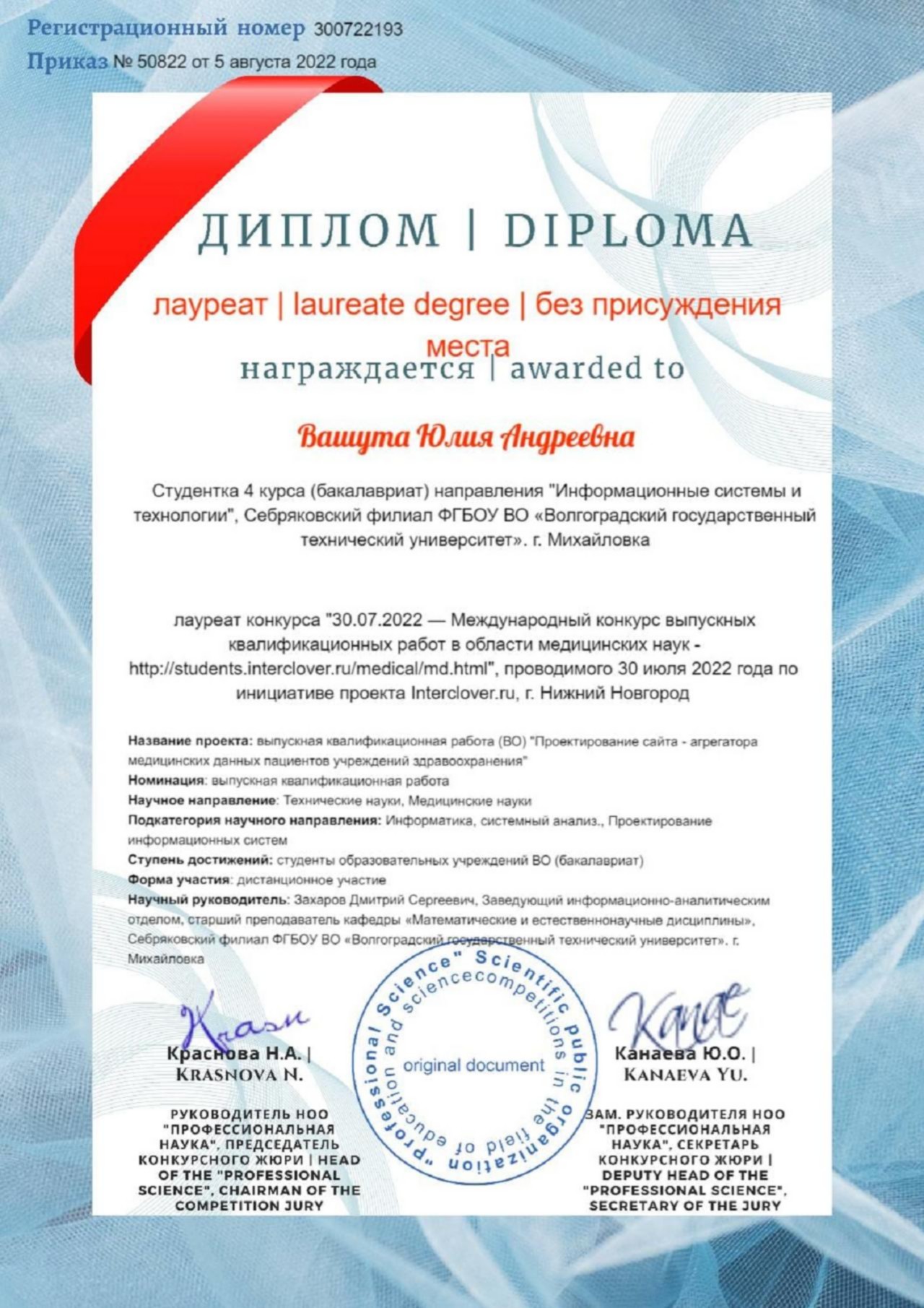 - в номинации «Международный конкурс ВКР в области медицинских наук» - лауреат конкурса.