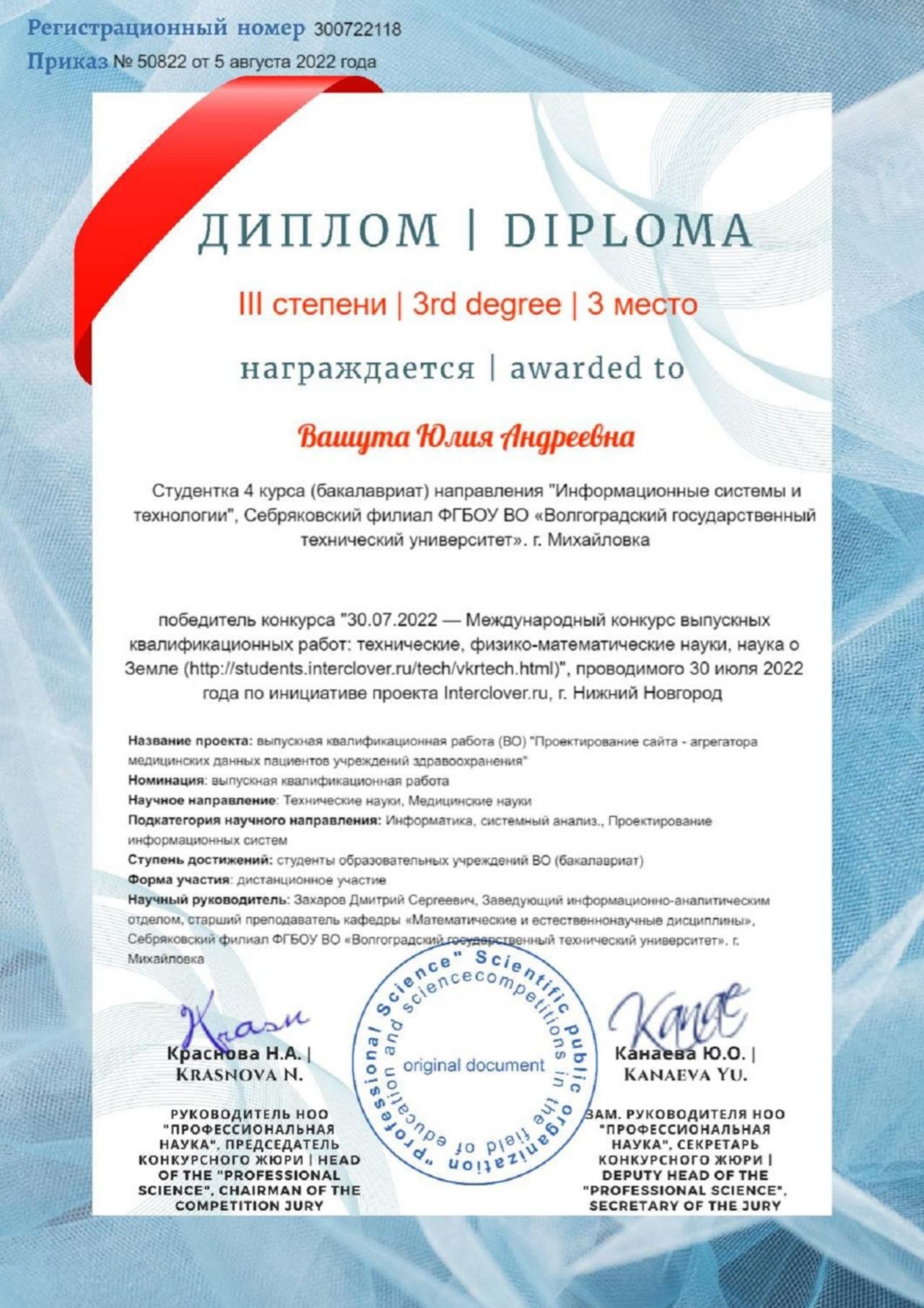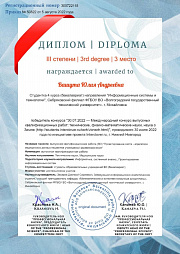 - в номинации «Международный конкурс ВКР: технические, физико-математические науки, наука о Земле» - диплом 3 степени;