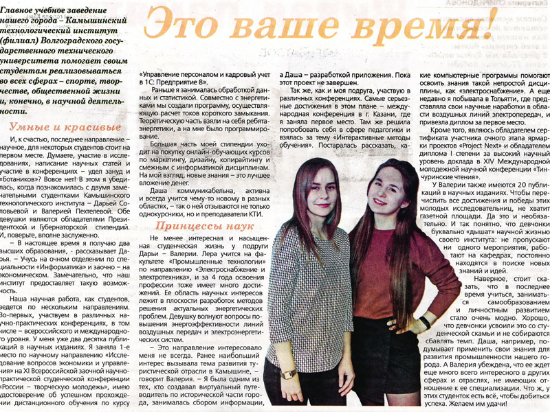И, к счастью, последнее направление - научное, для некоторых студентов стоит на первом месте. Думаете, участие в исследованиях, написание научных статей и участие в конференциях - удел зануд и «ботаников»? Вовсе нет! В этом я убедилась, когда познакомилась с двумя замечательными студентками Камышинского технологического института - Дарьей Соловьевой и Валерией Пехтелевой. Обе девушки являются обладателями Президентской и Губернаторской стипендий. И, поверьте, вполне заслуженно.