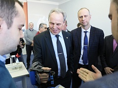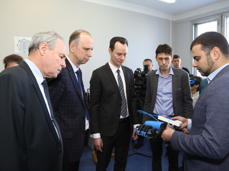 Когда вошли в помещение Центра, сразу бросилось в глаза – очень много детей, что было не удивительно. Удивило другое: зашла довольно большая группа взрослых людей в сопровождении нескольких телевизионных камер, журналистов. «Посмотрите, дети не обращают на нас никакого внимания», – осторожно заметил В.И. Лысак. И это было так здорово, поскольку было очевидно – дети настолько увлечены тем, чем они занимаются, что им в этот момент не может помешать ничто и никто! Взрослые с пониманием к этому отнеслись и постарались не сильно отрывать юных инженеров от их любимого дела. А заняться ребятам было чем. Судите сами: в ЦМИТе 9 шлемов, с помощью которых можно проводить виртуальную медицинскую операцию, сборку и разборку автомобиля, а с помощью другого нейроинтерфейса заниматься изучением активности коры головного мозга! Сегодня с нескрываемой гордостью гостям были показаны 6 фрезерных станков, токарный, лазерный станки, уникальная лаборатория виртуальных и нейротехнологий, специализированное программное обеспечение для работ в области быстрого прототипирования и мелкосерийного производства био- и нейротехнологических систем. Можно смело сказать, что все эти шлемы, пульты и другое оборудование выглядят, как картинки из будущего! Но были в Центре и не только начинающие исследователи. Их старшие товарищи показали сегодня и другие разработки, в частности тренажер для пассивного развития мелкой моторики пальцев руки после травм и инсультов Rejoint, который изготавливается индивидуально для каждого человека в зависимости от размера кисти и пальцев. Научный руководитель опорного вуза без сомнений испытал тренажер на себе, вернее, на своей руке, впрочем, на то он и научный руководитель.
