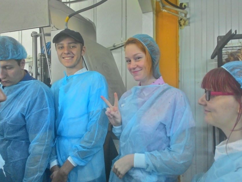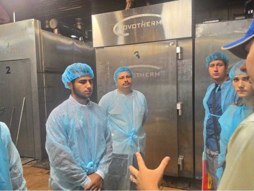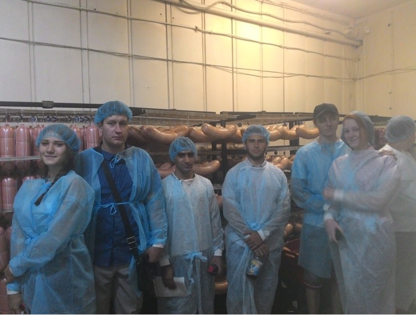 Далее будущим политехникам была выдана спецформа. Первым аппаратом, с которым столкнулись члены группы, стало устройство для дезинфекции рук, в которое необходимо было поместить руки ладонями вниз и дождаться пока загорится зеленая лампочка. Затем молодые люди посетили цех, предназначенный для подготовки полученного сырья. На специальном оборудовании осуществляют обвалку, жиловку, а в зависимости от вида и сорта колбасного изделия путем регулировки параметров вращения барабана и скорости резки ножей изготавливают фарш необходимой консистенции. Следующей машиной, вызвавший живой интерес у абитуриентов, было оборудование для шприцевания фарша в оболочку. После этого юноши и девушки посетили цех термообработки и охлаждения колбасной продукции. Во избежание образования вредных бактерий после печи, из которой выходит изделие с температурой порядка 70 градусов, его необходимо быстро охладить водой. На этой стадии была разработана собственная система охлаждения, для которой были спроектированы разбрызгивающие устройства, подобраны емкости и насосы, рассчитаны необходимые параметры для подаваемой воды. При реализации данной задачи также были использованы базовые знания, полученные при изучении таких дисциплин как: расчет и конструирование элементов оборудования, гидравлика, насосы, которые преподаются на кафедре «Химия, технология и оборудование химических производств» (ВХТО). После охлаждения готовая продукция упаковывается и отправляется уже потребителю.