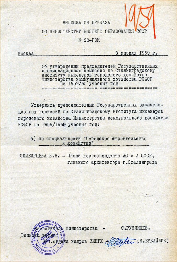 Народный архитектор СССР, член-корреспондент Академии архитектуры, лауреат Государственной (Сталинской) премии Василий Симбирцев также являлся профессором кафедры архитектуры Сталинградского института инженеров городского хозяйства, председателем государственной экзаменационной комиссии в вузе по специальности «Городское строительство и хозяйство». Об этом оставил свои воспоминания Г.М. Барсуков, первый выпускник горхоза, которому посчастливилось слушать лекции знаменитого архитектора.