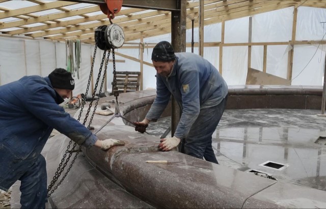 По завершении вышеуказанных работ специалисты приступили к обратной облицовке – каждый элемент был предварительно пронумерован. Для обустройства гранитных плит, самые крупные из которых весят до 300 кг, использовался мини-кран.
