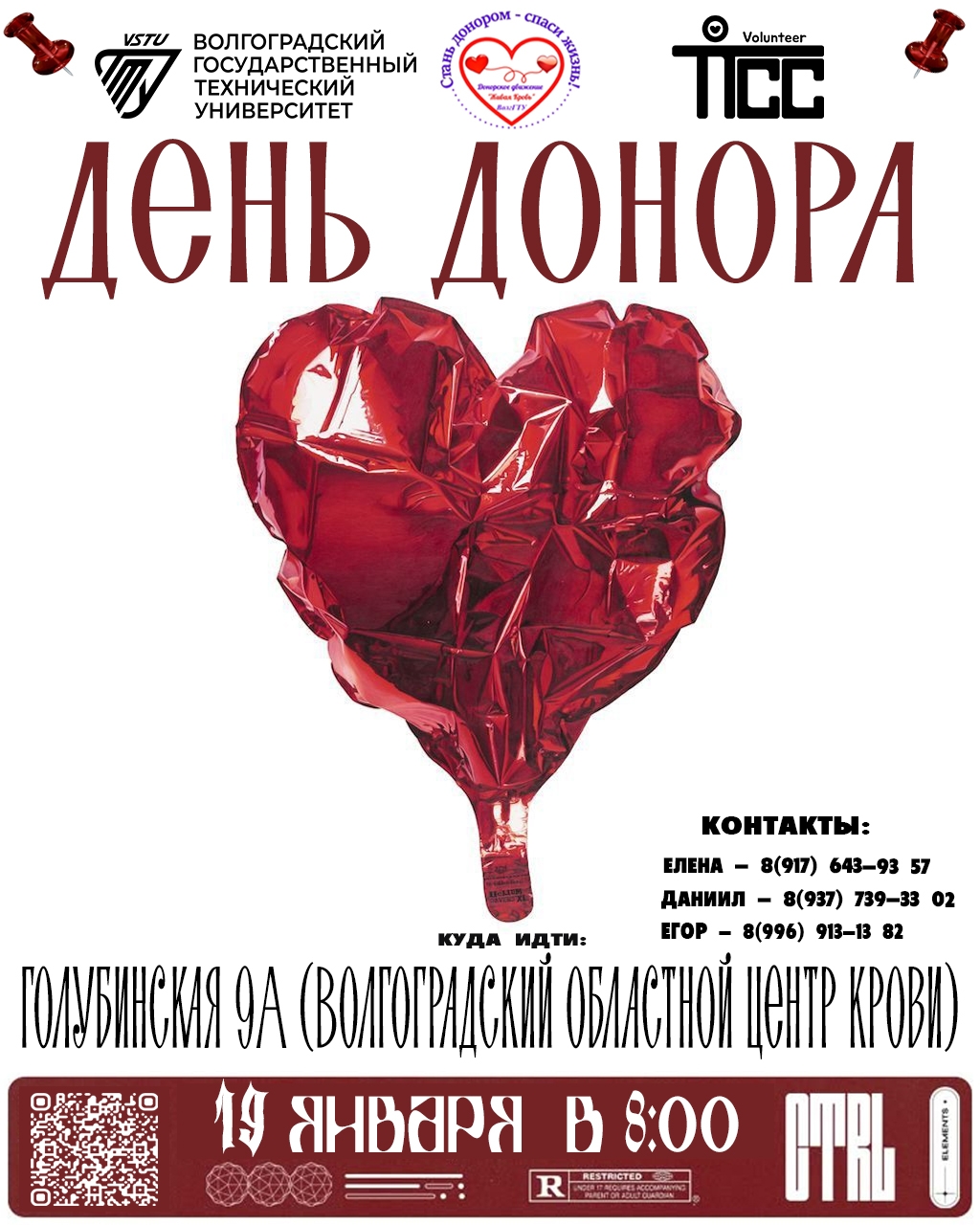 Проект корпоративного донорства ВолгГТУ «Живая кровь» приглашает политехников 19 января принять участие в очередном Дне донора. Как всегда, он пройдет в Волгоградском областном центре крови по адресу: ул. Голубинская, 9а, в 8:00.