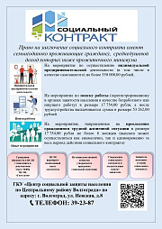 Более подробно узнать об условиях заключения социального контракта можно в ГКУ «Центр социальной защиты населения по Центральному району Волгограда» по адресу: г. Волгоград, ул. Невская, д.8. Телефон: 39-23-87