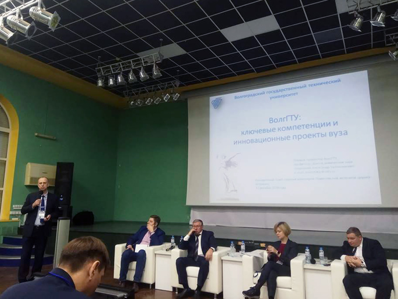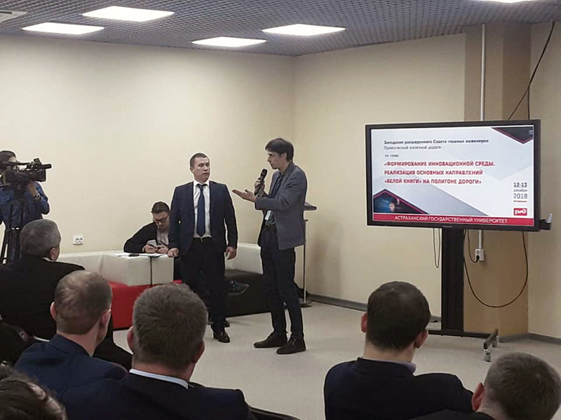 На базе Астраханского госуниверситета на минувшей неделе состоялось открытие Расширенного совета главных инженеров Приволжской железной дороги. Основной темой мероприятия было заявлено формирование инновационной сферы и реализация основных направлений «Белой книги» — системного документа по научно-технической политике компании. Принять участие в работе совета пригласили изобретателей и учёных из высших учебных заведений, бизнес-инкубаторов и технопарков. Принимали участие в его работе и политехники: первый проректор А.В. Навроцкий, директор Инжинирингового центра «Полимерные материалы и технологии» Алексей Николаевич Гайдадин, представитель Инжинирингового центра Андрей Анатольевич Косенов и заведующий кафедрой «Системы автоматизированного проектирования и поискового конструирования» факультета электроники и вычислительной техники Максим Владимирович Щербаков.