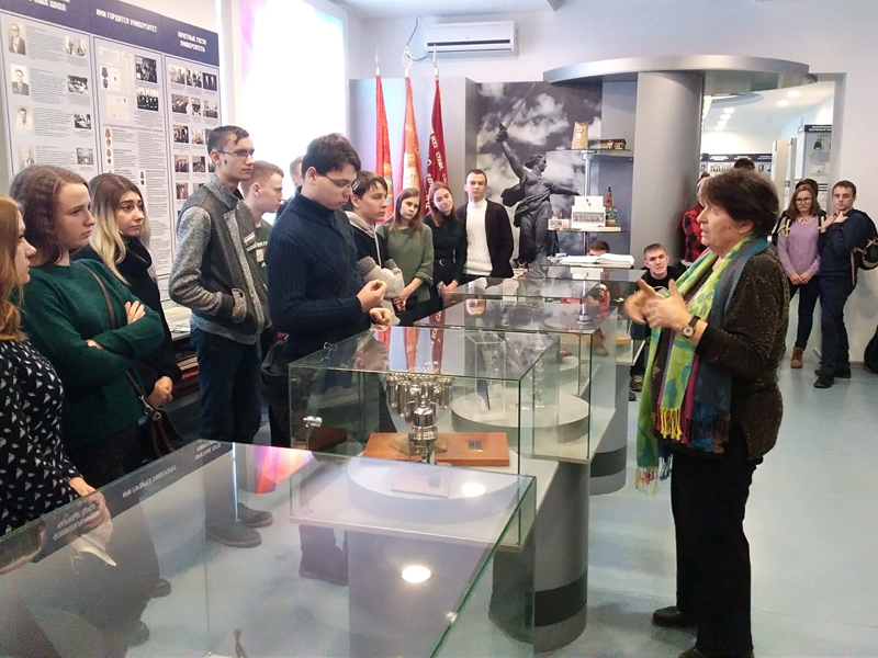 Далее делегация отправилась на вкусный обед в кафе города, после чего студенческая группа посетила головной вуз – Волгоградский государственный технический университет. Заведующая музеем истории и науки ВолгГТУ Светлана Петровна Мишта познакомила ребят с экспозициями, посвященными довоенному и военному прошлому, рассказала интересные истории из жизни студентов и преподавателей того времени, о том, как вуз развивался во второй половине прошлого века и какими исследованиями занимаются ученые опорного университета сегодня.