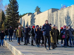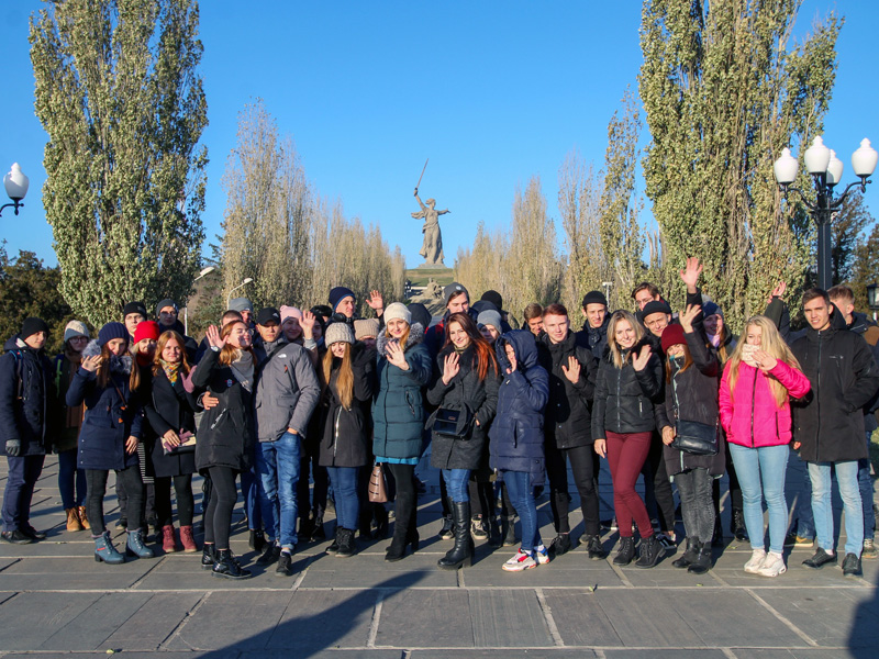 Первую остановку сделали на Мамаевом кургане. Несмотря на то, что многие студенты уже не раз посещали мемориальный комплекс, желающих подняться на высоту 102 меньше не стало. Благодаря опытному экскурсоводу ребята узнали для себя много нового, некоторые из них даже подискутировали с гидом, рассказав интересные факты из истории.
