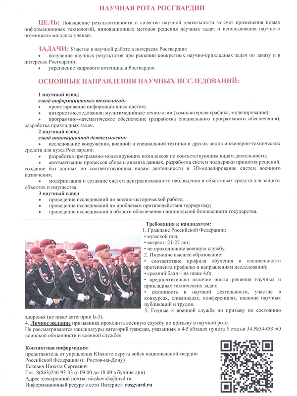 Студентов, достигших высоких результатов в этой сфере, приглашают пройти военную службу по призыву в рядах учебно-научной роты Федеральной службы войск национальной гвардии Российской Федерации.