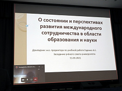 О состоянии и перспективах развития международного сотрудничества в области образования и науки рассказывал и.о. проректора А.Е. Годенко. В силу некоторых обстоятельств, он единственный сегодня работал в онлайн-режиме.