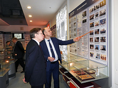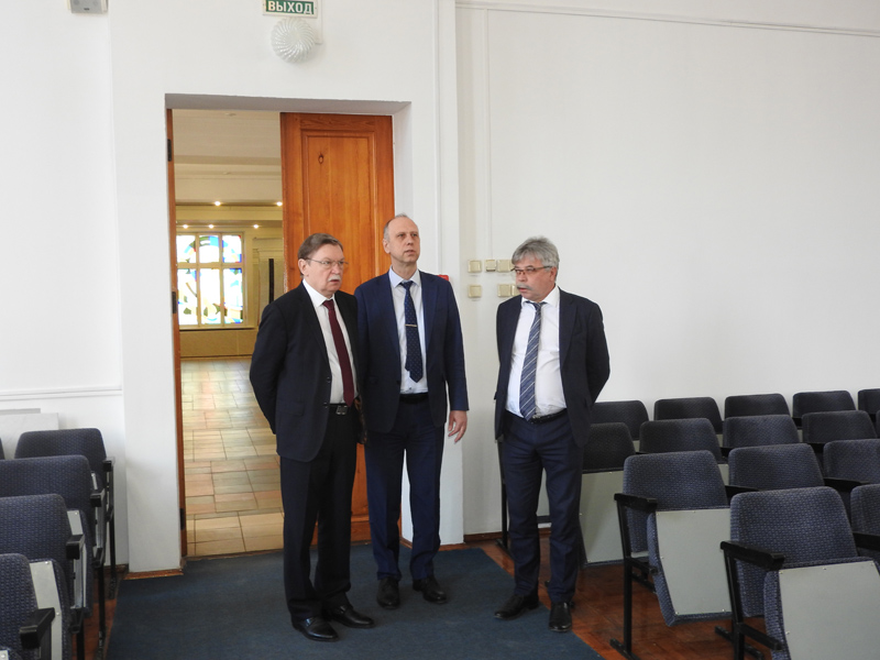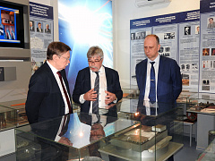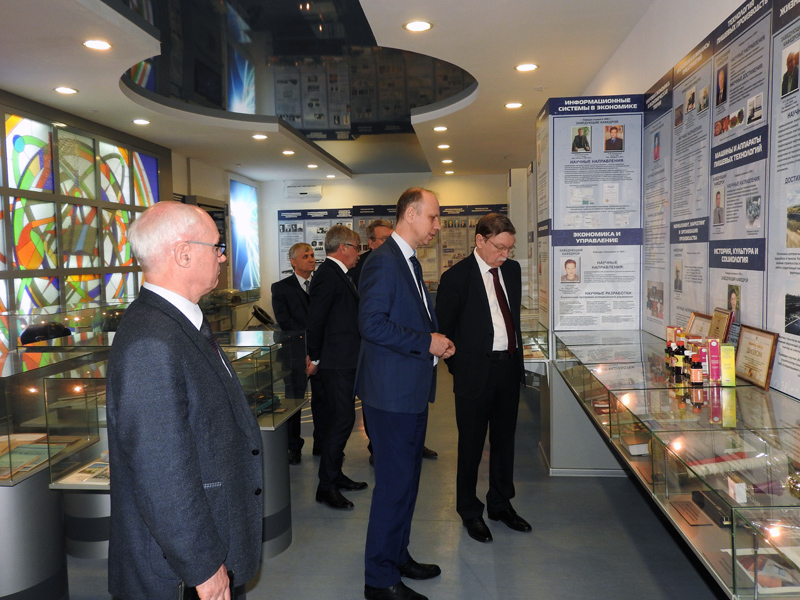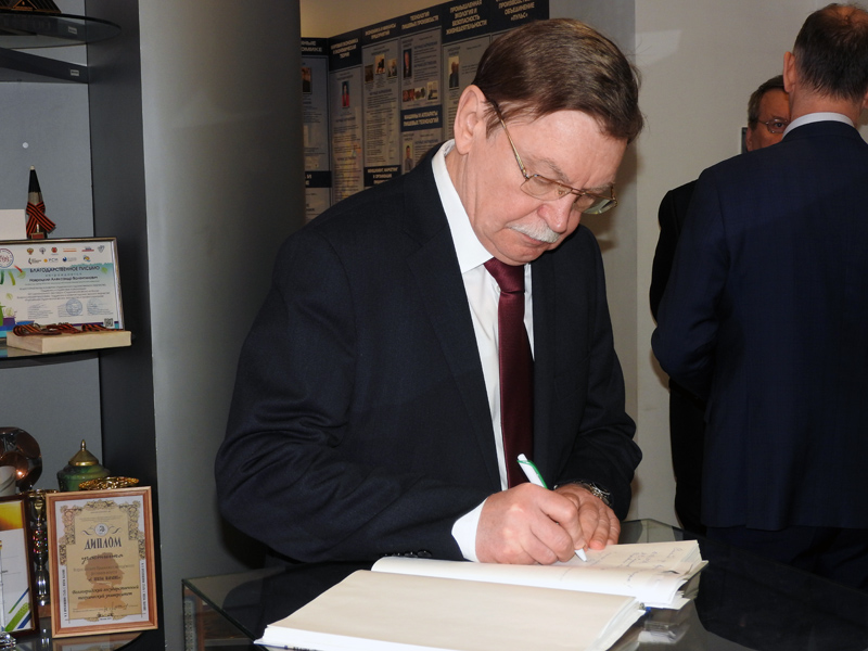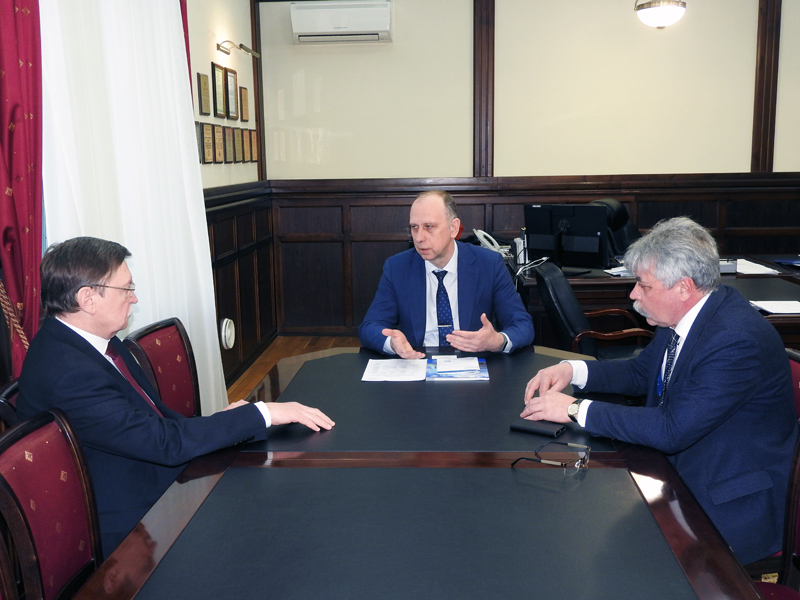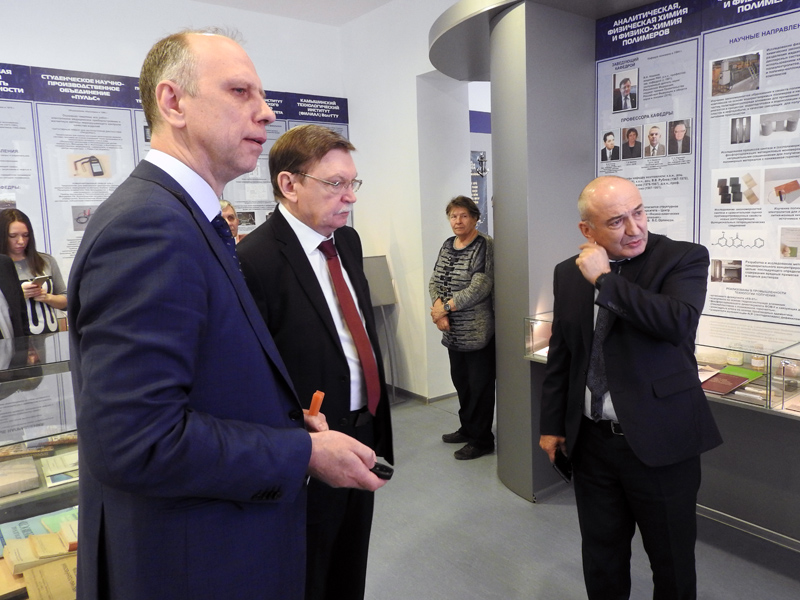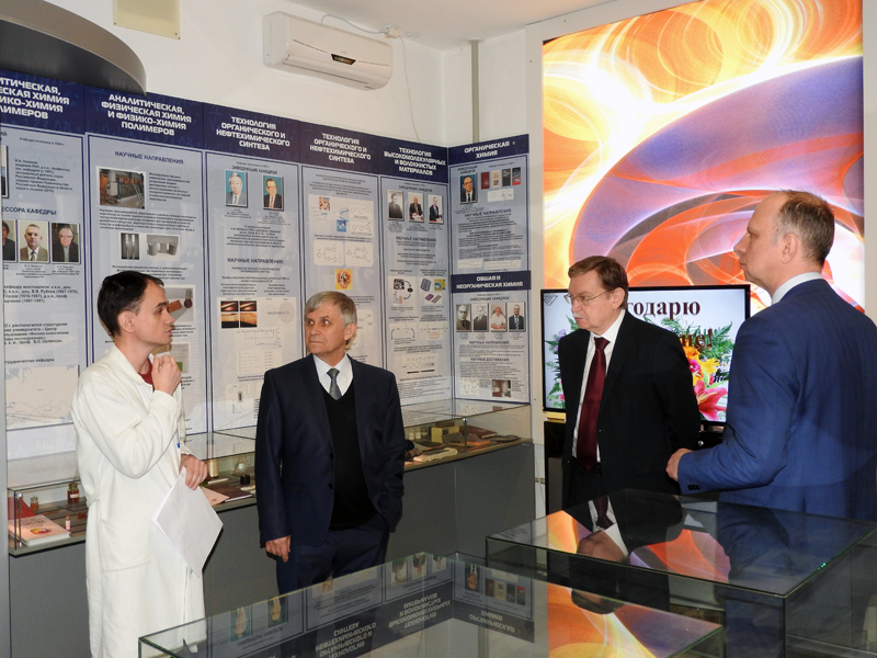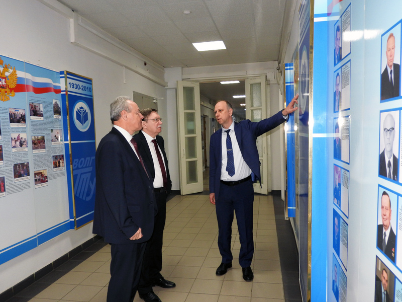 Сергей Олегович находится в Волгограде уже в течение нескольких дней, и все это время ученые медицинского университета и химики нашего вуза обсуждают возможности сотрудничества, совместных исследований в области медицинской химии и проведения большой научной конференции в городе на Волге. Поэтому и посещение опорного университета для С.О. Бачурина началось с осмотра корпусов, чтобы иметь представление, какими ресурсами располагает вуз. Ректор ВолгГТУ Александр Валентинович Навроцкий показал гостю новый корпус, актовый зал в ГУКе, а уже за чашкой чая в своем кабинете познакомил с историей Волгоградского государственного технического университета, которому в мае исполнится 90 лет.