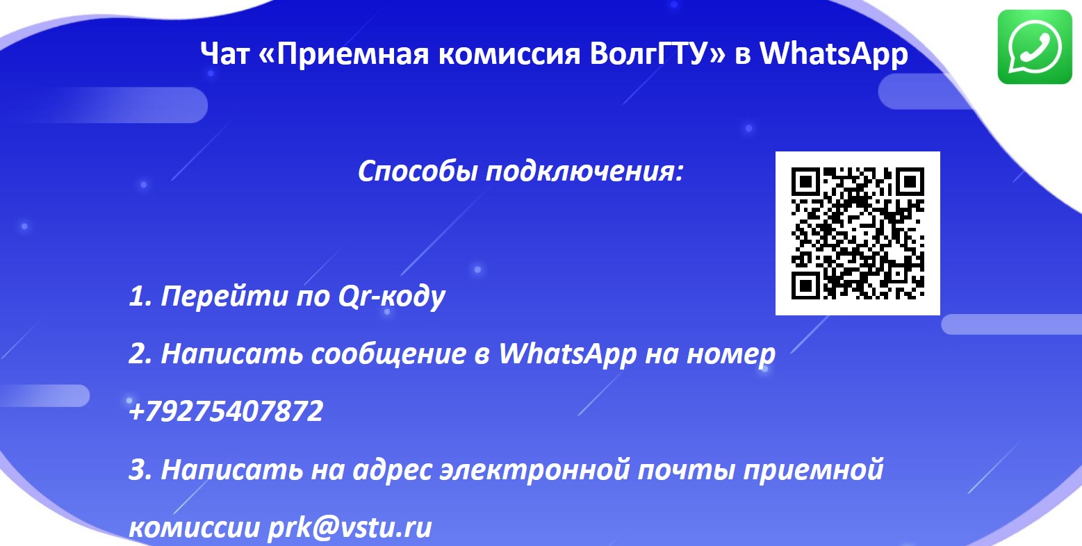 По итогам консультаций у родителей и абитуриентов возникло множество вопросов. Кстати, теперь появилась возможность задать вопрос и следить за изменениями в Правилах приема не только на сайте, в социальных сетях, по электронной почте, телефону или при личном посещении, но и используя чат «Приемная комиссия ВолгГТУ» в WhatsApp. Информация о способах подключения к чату представлена во вложении.