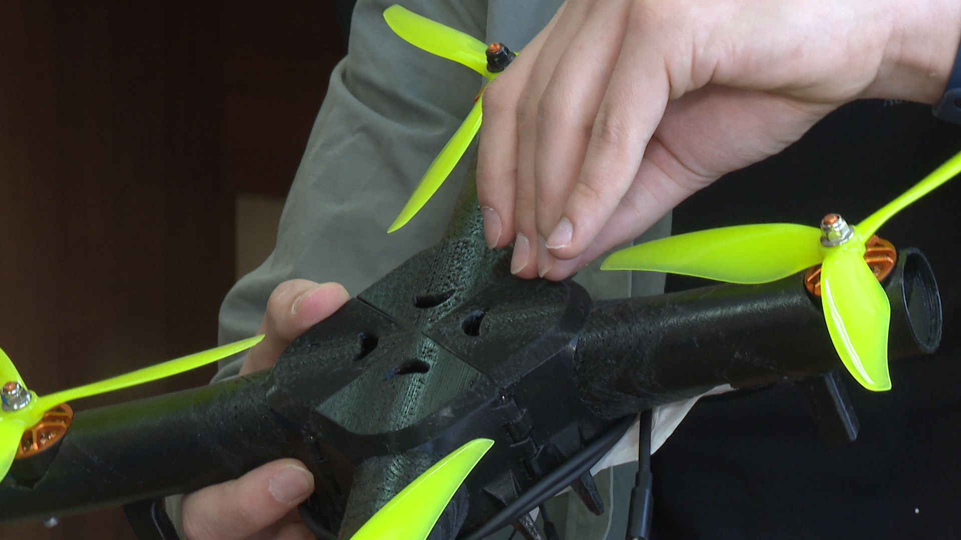 Основной задачей было повысить прочность рамы аппарата. Детали печатали на 5D-принтере. Подбирали материалы и режимы производства: температуру, скорость печати. В итоге применили технологию непрерывного армирования углеволокном.